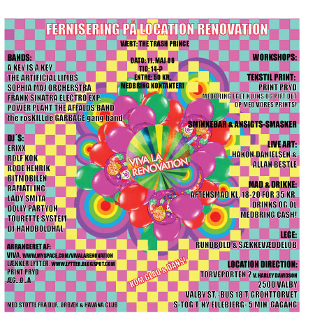The organization "Viva La Renovation" is hosting a day of alternative and creative workshops! We host the day in order to introduce our new location and create a financial platform for our work with Roskilde Festival 08.