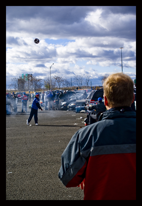 People where playing before the big game, Here you see a Father and his son warming up to watch the game.