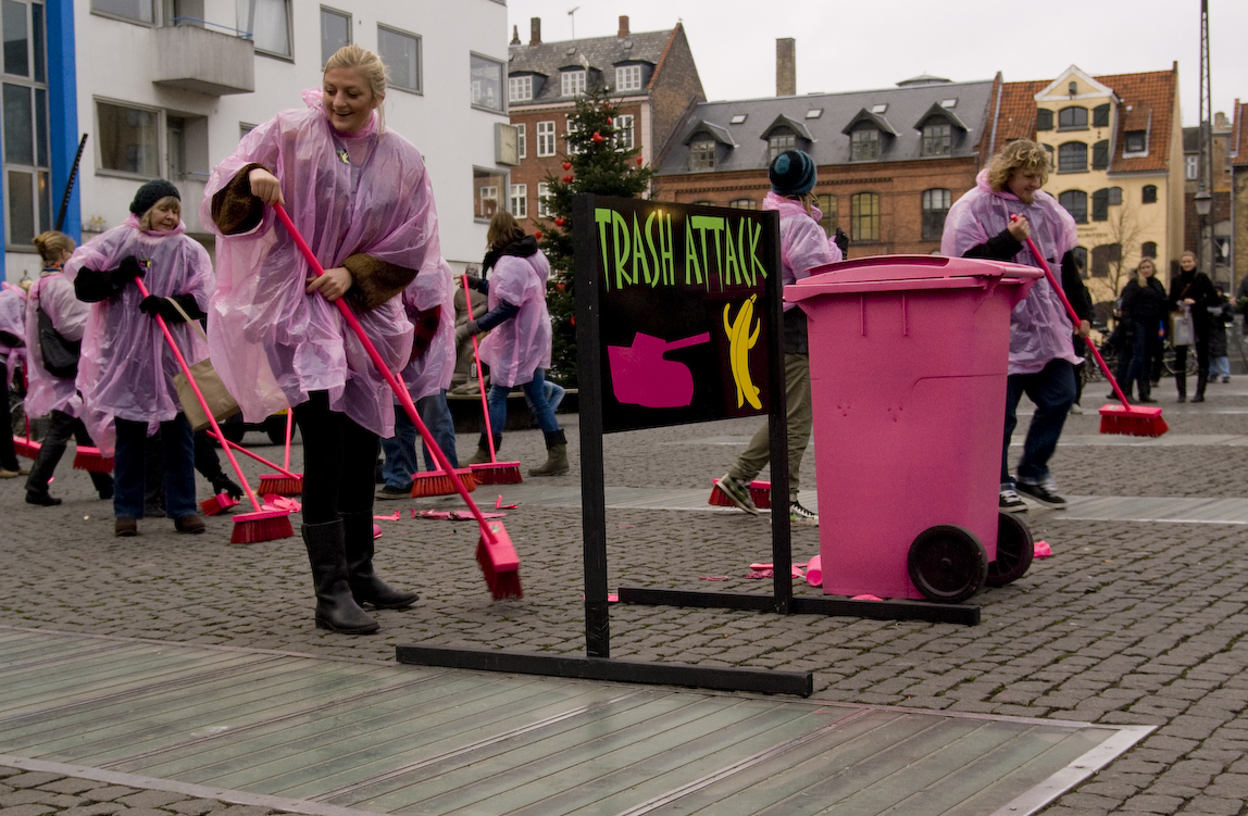 A group of young environmental minded people in Copenhagen took action against dump of waste in the streets. By dressing up in pink suits and using pink dresses they ended a tree day long campaign. They carried out the message with pink light installations and pink colored trash at the event area, Christianshavns torv. I like the way of communicating a message through fun initiative and not by blaming. A bit like the mindset of the organization Viva La Renovation which is also Copenhagen based. See more about TRASH ATTACK here ---> and here.