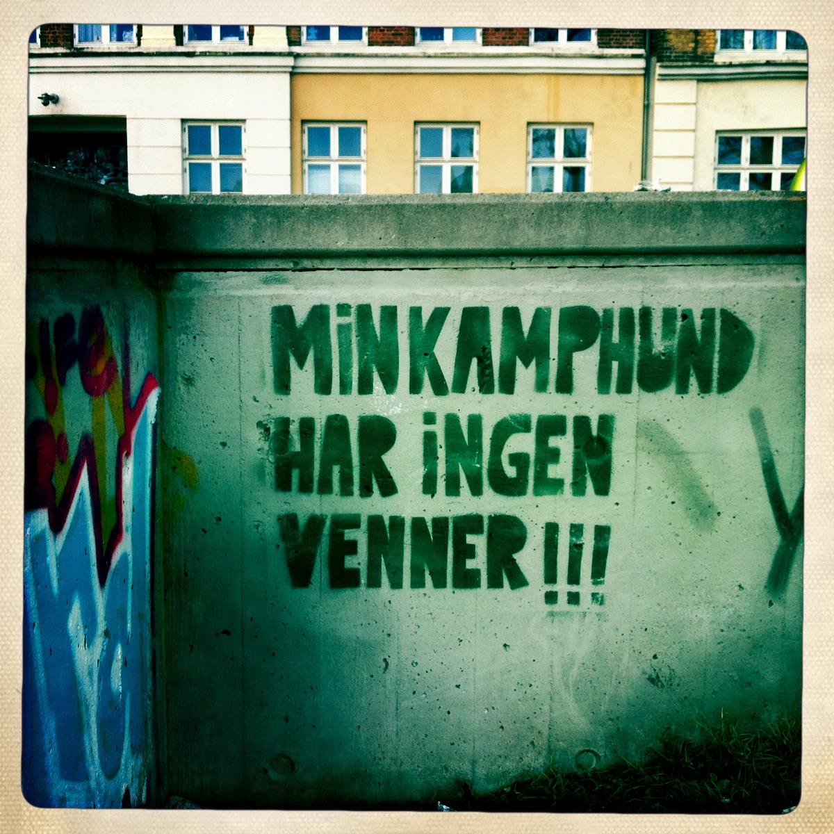 The other day I came by this stencil in Copenhagen. "Min Kamphund har ingen venner" meaning "My pit bull doesn't have any friends"